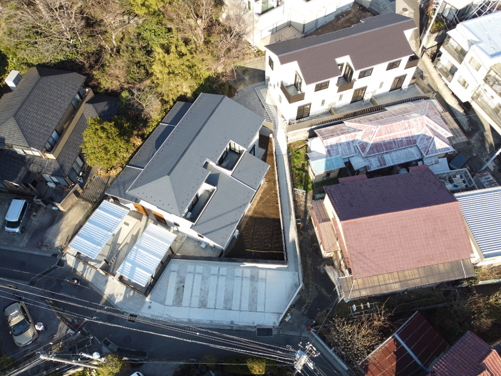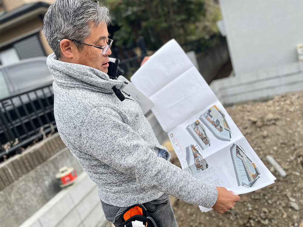 「お施主さんと話を重ねながら土地の条件を調べ、相続した資金のこと、どんな工程ならコストが抑えられるか、職人さんの負担をどう減らせるかまで考えました。そして何より、お施主さんは仮住まいからできるだけ早く、完成した家に引っ越したいと思っていたんですね。それらすべてを逆算して、賃貸住宅と二世帯住宅の建築を1年で完了させる計画を立てたのです」