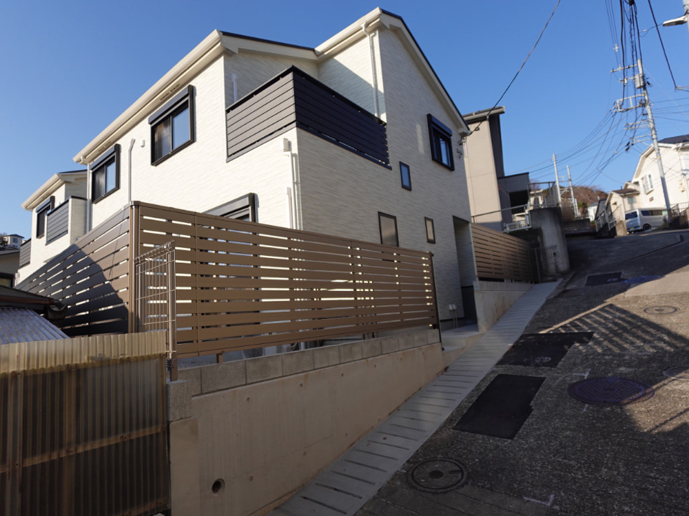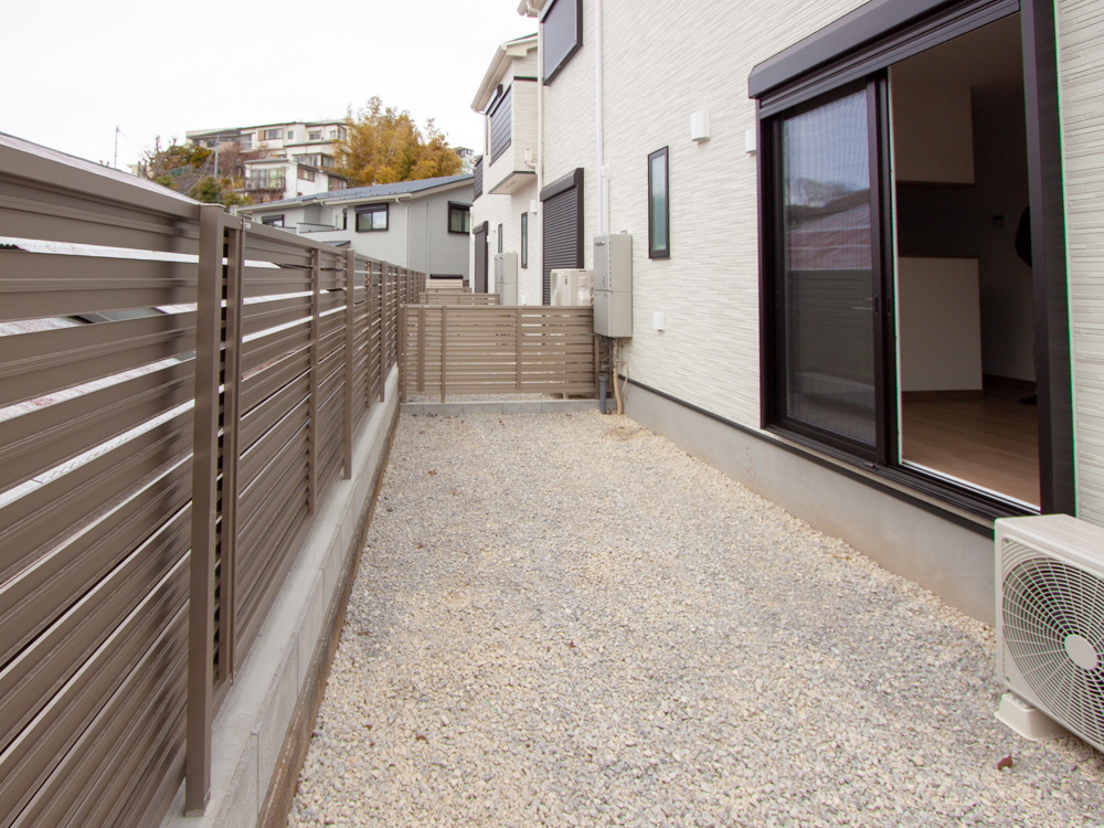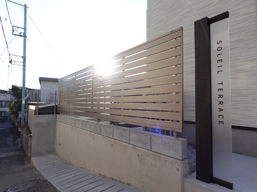 外構の打ち合わせが一通り終わり、私たちは二世帯住宅の横に伸びる長いアプローチを進みました。すると3世帯が暮らせる長屋タイプの賃貸住宅「SOLEIL TERRACE(ソレイユ テラス)」があらわれてきました。