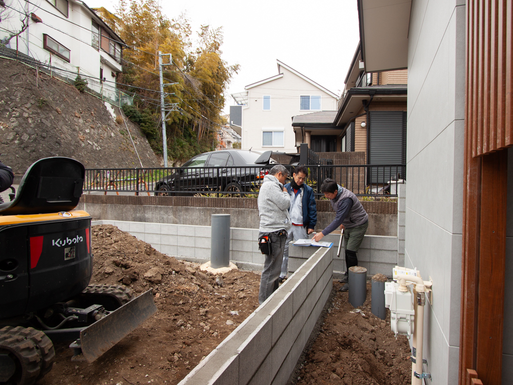 外構の職人さんと意見を交わす山田さんたちの姿は、真剣さの中にどこか楽しさが感じられました。