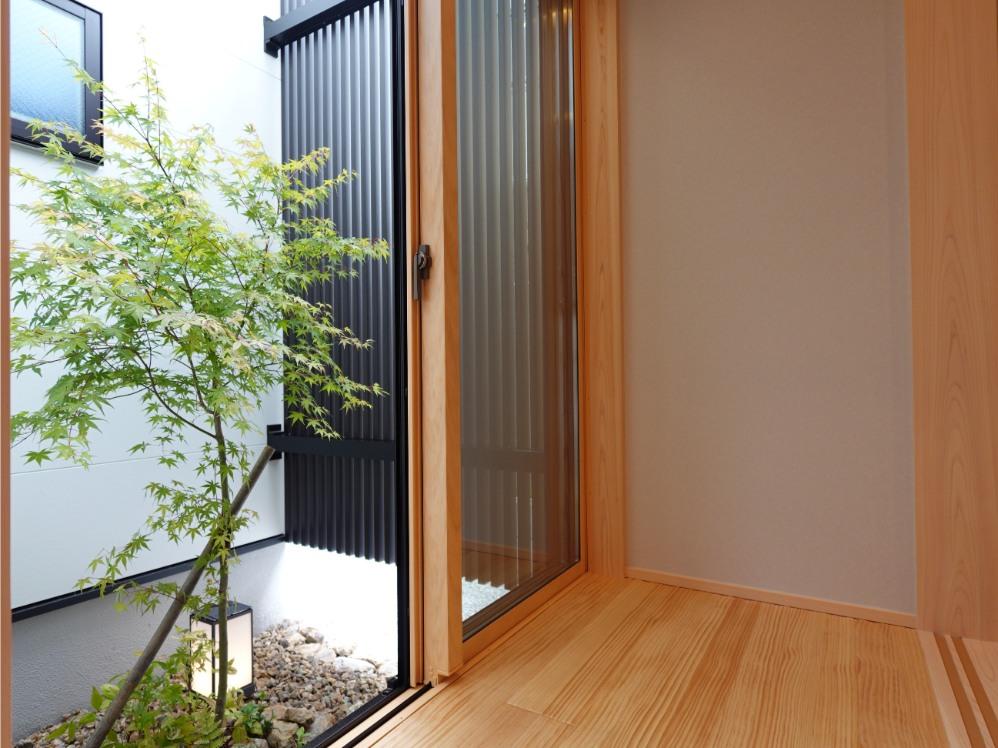 「玄関前にこういう庇(ひさし)が出たテラス的なスペースのある家って都会だとそんなにないでしょ?見学に来てくれたお客さんはみんな『こういう感じっていいですね』って言ってくれる。田舎育ちの僕には当たり前の空間なんだけど…。いわゆる縁側的な意味も持たせた場所なんだ」