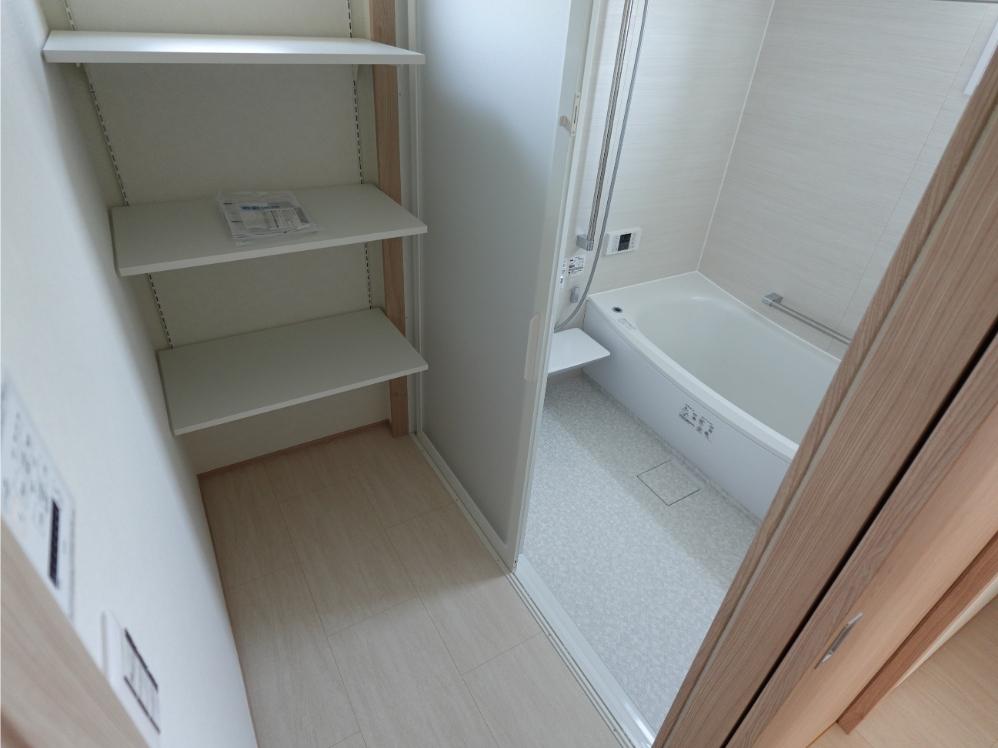 浴室につながるこのスペースは脱衣する目的以外に大抵洗面所と洗濯機置き場が兼用になっていたりしますが、ここは脱衣のみの目的で区切られています。