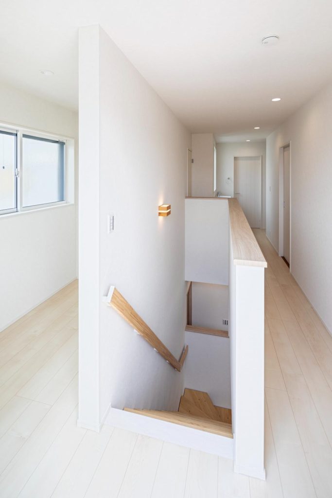 オープン階段で2階に上がると右側にランドリースペースとサンルーム、左側には寝室や子供部屋へ向かう廊下が伸びていきます。