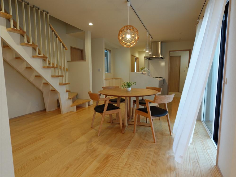 リビングの隣にダイニングがあり、木製の丸テーブルが置かれています。