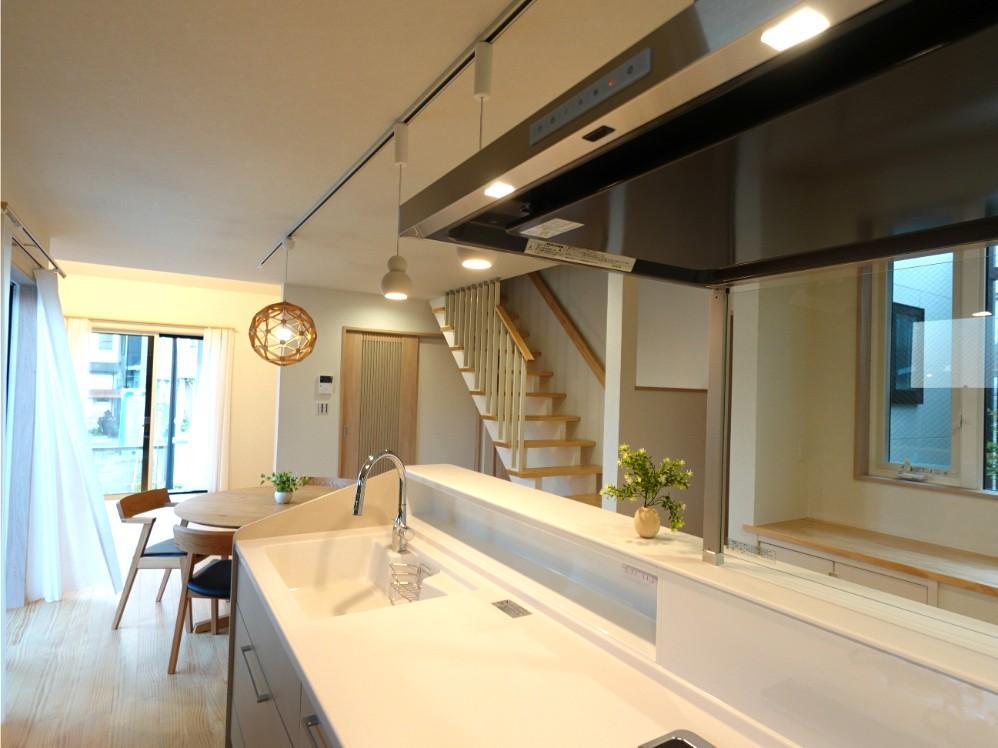 カウンターキッチンの前面には引き戸の収納があり、家族が集まる空間をスッキリさせる工夫が随所に見られます。