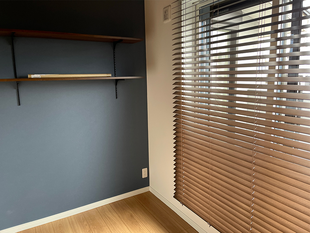 2階の妹さんのご主人の部屋は、造作棚と木製ブラインドによって、穏やかで落ち着いた印象の空間になっていました。