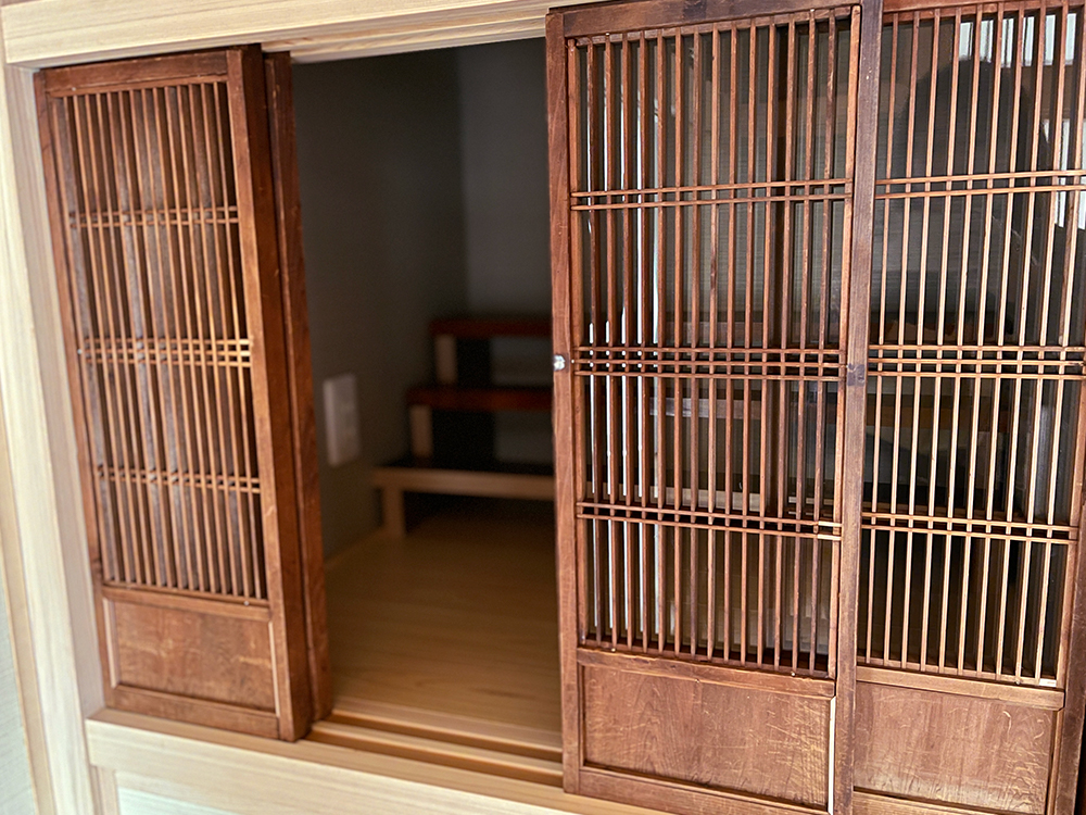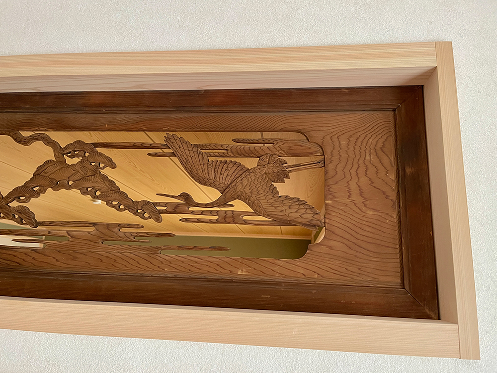 天井近くに風通しや採光確保のために設けられた「欄間」は、鶴や松が彫られ、格式高い風格を感じさせます。旧家から取り外した際には補修が必要な状態だったため、神奈川県内の業者へ手あたり次第に連絡を取り、ようやく修復を担う方が見つかったそうです。丁寧に補修を重ね、よみがえらせたといいます。