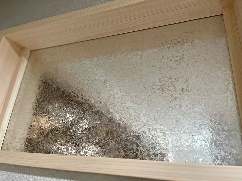 いまでは作れる人が少なくなった貴重な「昭和板ガラス」には、植物の模様が凹凸で表現されていて味わいがあります。