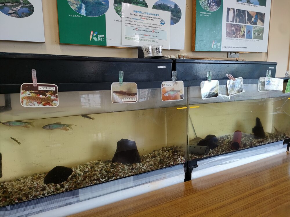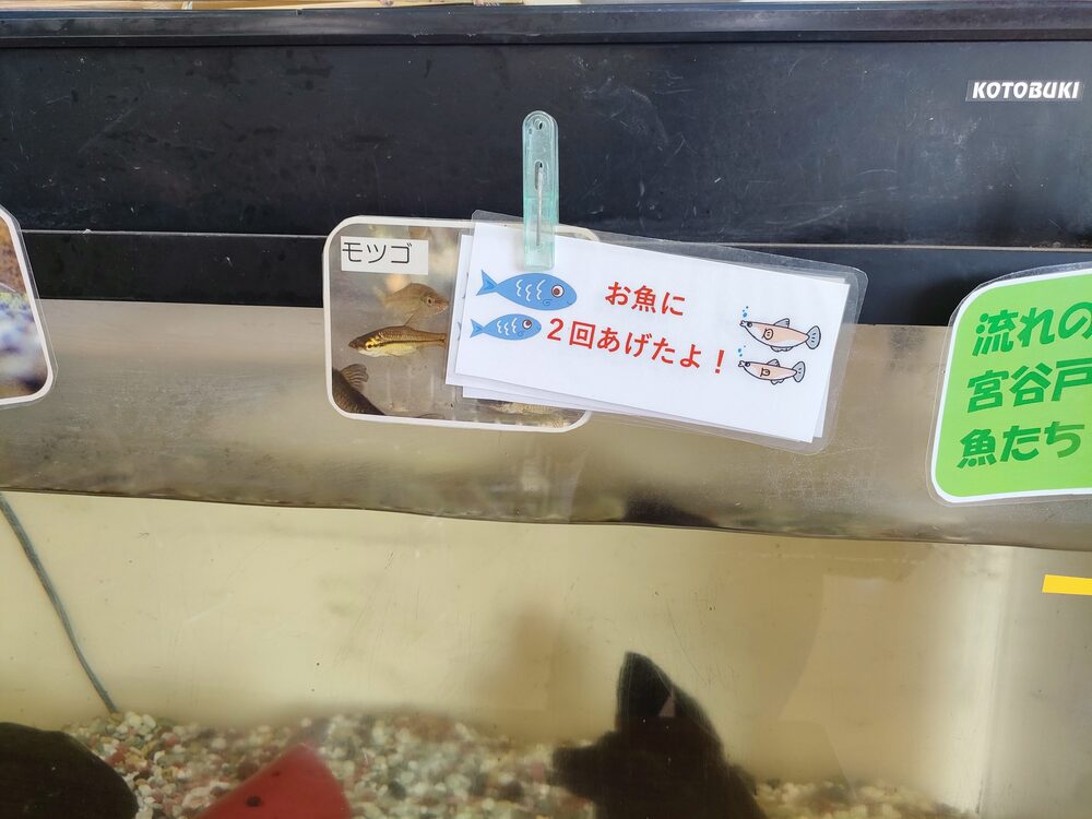 水槽には大池や早渕川で見られる魚たちがおり、生態系についても係の方が優しく教えてくれます。遊びながら自然のことを学べる、まさに一石二鳥の体験です。
